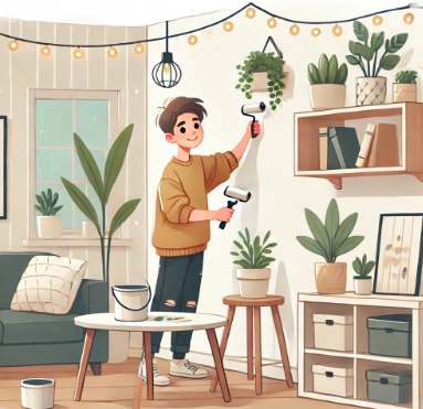 포인트 벽지 또는 셀프 페인팅: 한쪽 벽만 색다르게 꾸미면 단조로운 분위기가 확 바뀌어요.
